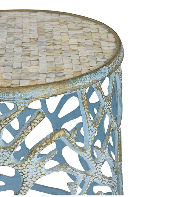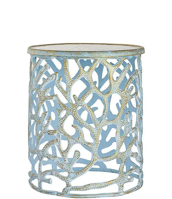 - The blue brushed aluminum frame has a climbing coral motif with a gold patina.