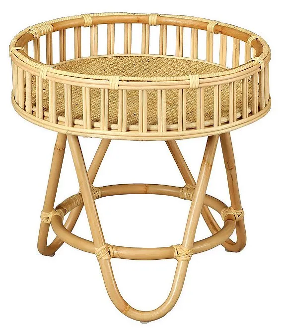 • A small round table with a fixed tray top made from wrapped rattan and woven rattan caning.
