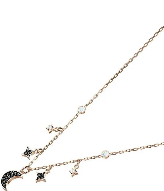 The beauty of the moon and stars is stunningly captured in this coolly romantic rose gold-plated necklace. Dripping with crystal-laden symbolism in dark and light tones, this astronomically-inspired design feels both bohemian and luxurious. Perfect for layering with other necklaces in your collection, it can also be accessorized with the matching bracelet and ring.