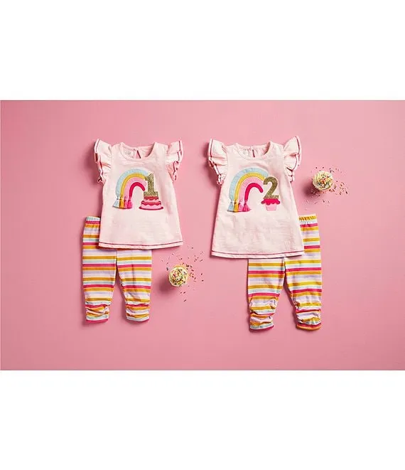 - Solid knit tunic with round neckline, flutter sleeves, tassel rainbow, cake, and glitter '1' applique, button back closure, contrast stitching and straight hem
