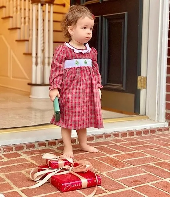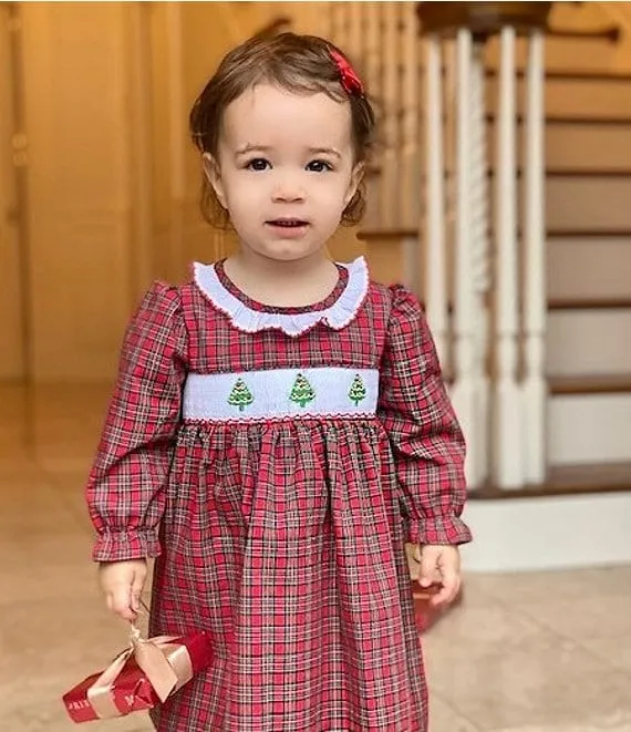 • Edgehill Collection Baby Girls 3-24 Months Round Neck Long Sleeve Christmas Tree Smocked Dress