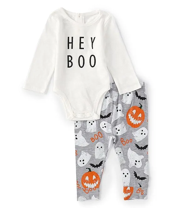 - Long sleeve bodysuit with round neckline, long sleeves and contrasting "Hey Boo" verbiage on the front plus ribbed binding, a snap back and snap-leg closures to make changing easy.