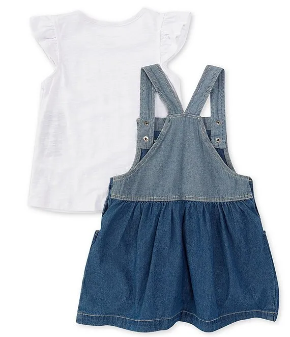 - Square neck, sleeveless, straps, logo colorful graphic design on the front also side pockets, denim coverall dress
