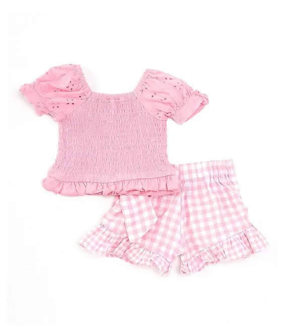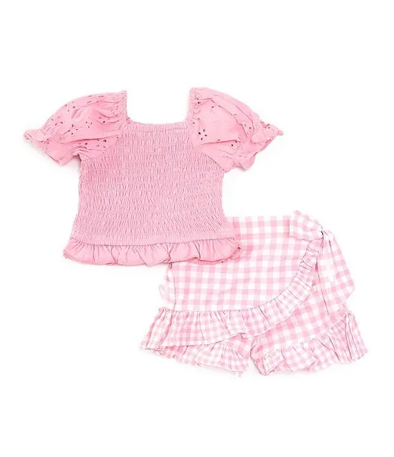 Baby Girls 3-24 Months Eyelet-Embroidered-Puffed-Sleeve Knit Top & Gingham Seersucker Skort Set