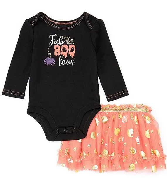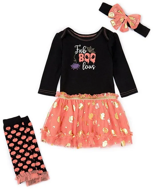 Baby Girls 3-12 Months Long Sleeve Fab Boo Lous Graphic Bodysuit Dotted Tutu Skirt & Dotted Leg Warmers Set