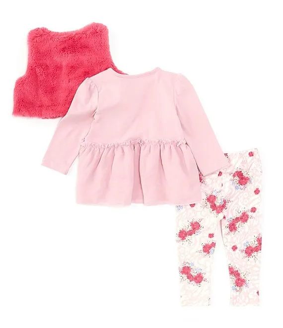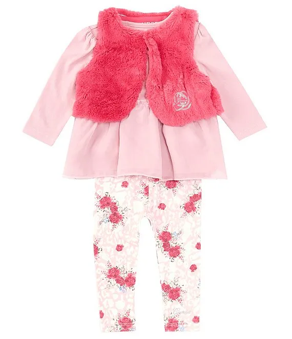 Guess Baby Girls 3-24 Months Sleeveless Faux-Fur Vest, Long-Sleeve Jersey Top & Printed Metallic Logo Leggings Set