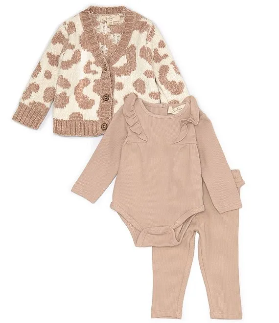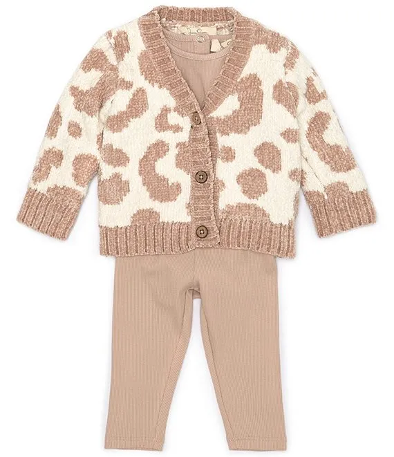 Baby Girls Newborn-9 Months Long Sleeve Printed Cardigan, Long Sleeve Solid Bodysuit & Solid Leggings Set