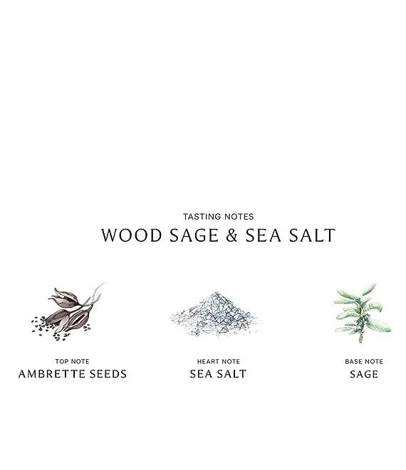 The combination of Wood Sage & Sea Salt with Bronze Wood & Leather creates a fresh woody fragrance, warming vetiver and guaiacwood, enlivened with sea salt freshness.