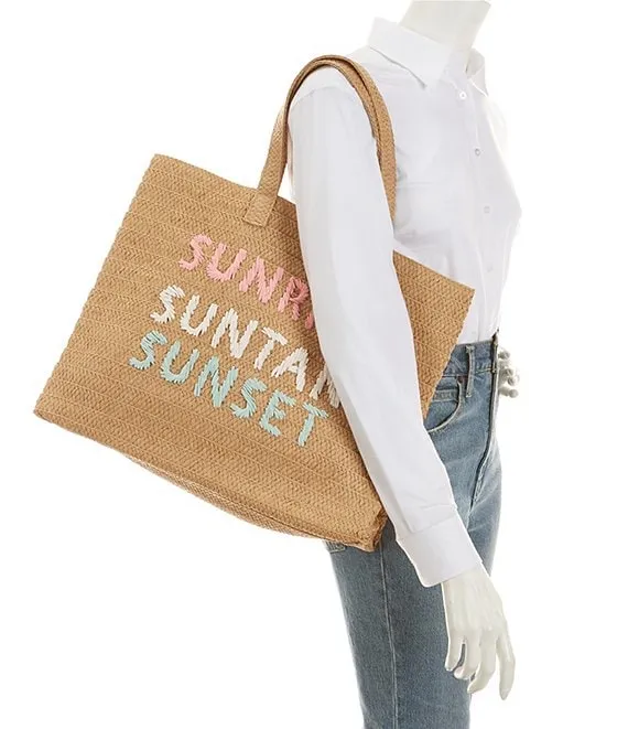From Btb Los Angeles, the Sunrise Sunset Straw Beach Tote Bag features: