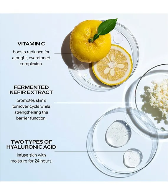 Key Benefits: Infuses skin with two types of Hyaluronic Acid to stay moisturized for 24 hours. • Targets dark spots and brightens skin with Vitamin C.• Promotes skin's turnover cycle while strengthening the barrier function with exclusive prebiotic Fermented Kefir Extract.• Recharges moisture with Yuzu Extract.