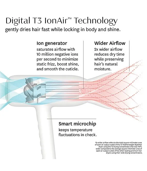 - Digital T3 IonAir™ Technology: Powers a wide, ion-infused airstream to gently dry hair fast while locking in body and shine