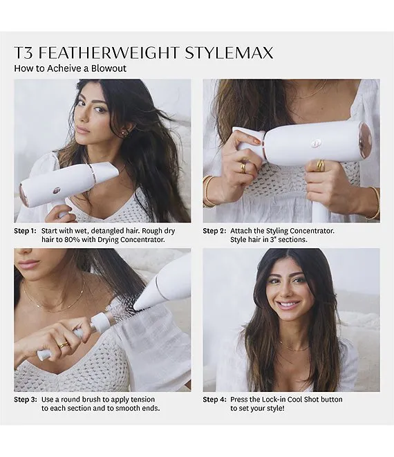 Meet your perfect heat match. The T3 Featherweight StyleMax professional hair dryer automatically customizes heat and airflow to your hair texture and styling goals for better results with less damage. Optimized for every hair type, four attachments pair with four unique Style Modes to rough dry, smooth, diffuse, or volumize. Just input your hair texture, secure your attachment, and match up your Style Mode. Advanced T3 StyleMax™ technology will automatically adjust 5 heat and 3 speed settings to maximize your results and minimize heat damage.Features: