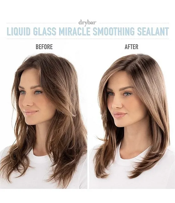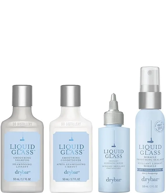 Glassy. Silky. Shiny. Drybar's Liquid Glass Collection is the ultimate frizz-fighting high-sheen dream team. Liquid Glass Smoothing Shampoo and Conditioner features a rich yet lightweight formula that cleans and conditions while helping to provide smooth, shiny hair. Liquid Glass Instant Glossing Rinse uses advanced Reverse-Micellar Technology to smooth hair and leave a silky, high-shine finish in just 10 seconds. Liquid Glass Miracle Smoothing Sealant uses heat-activated technology that wraps an invisible shield around each hair strand to provide frizz resistance, heat protection (up to 450°F), and a super-glossy, silky finish that lasts through three washes.