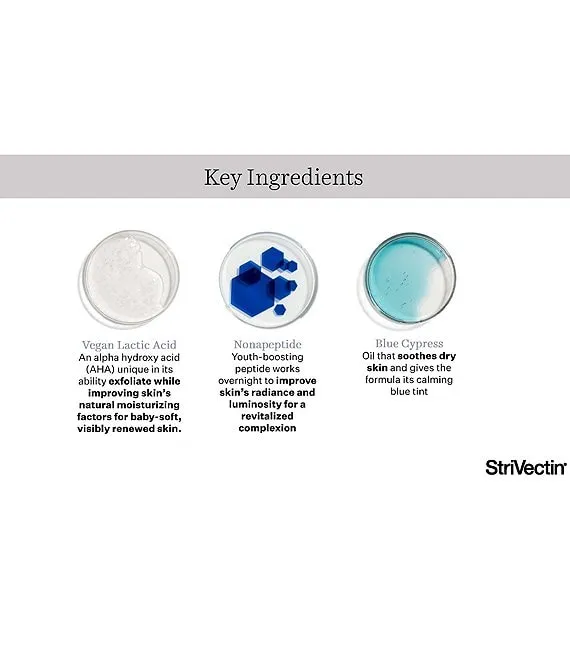 The unique exfoliating and moisturizing power of Lactic Acid plus barrier-strengtheningNIA-114™, dry skin-soothing Blue Cypress and a youth-boosting Nonapeptide revitalize skin, overnight.