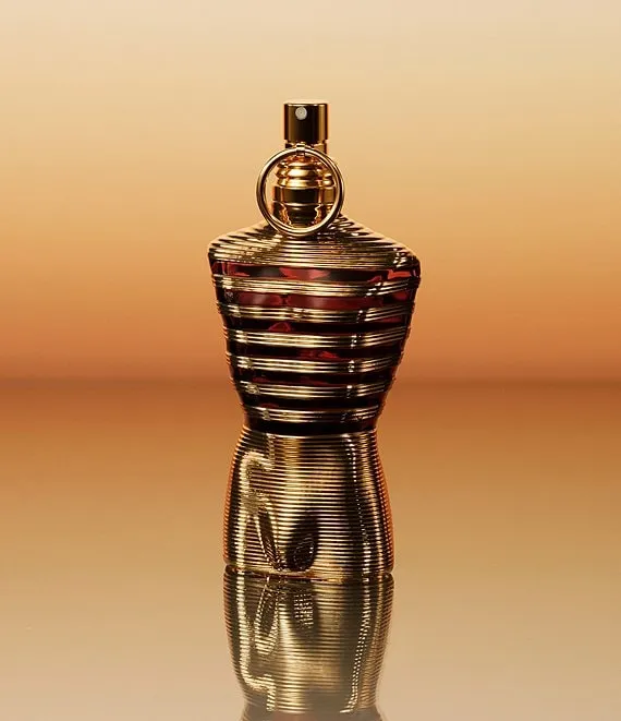 "Le Male Elixir sailor triggers a heatwave when he steps aboard! His fragrance is so intense that gold melts across historrid torso and metallic can. Woody aromatic amber sex appeal at its height, ablaze with sensuality beneath the translucent brown sailor top."