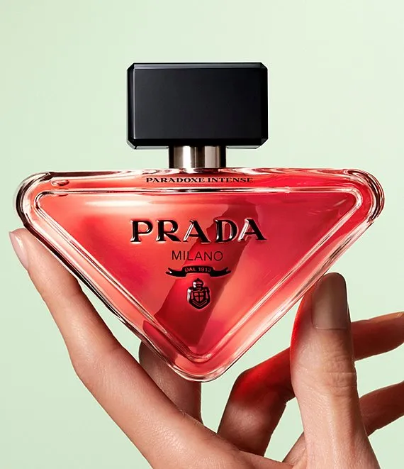 This perfume bottle is an expression of the House's essence of reinvention and predilection for contrasts. In a shift from the traditional perfume bottle architecture, this flacon is minimal and delicate at first glance, inspired by the original iconic Prada triangle logo, disruptively designed to rest on its side. The Prada coat of arms logo contrasts with the deep pink color of the fragrance. The bottle is finished with 'Paradoxe Intense' on its top chamfer.