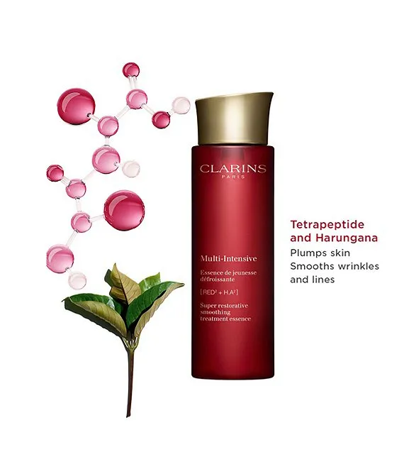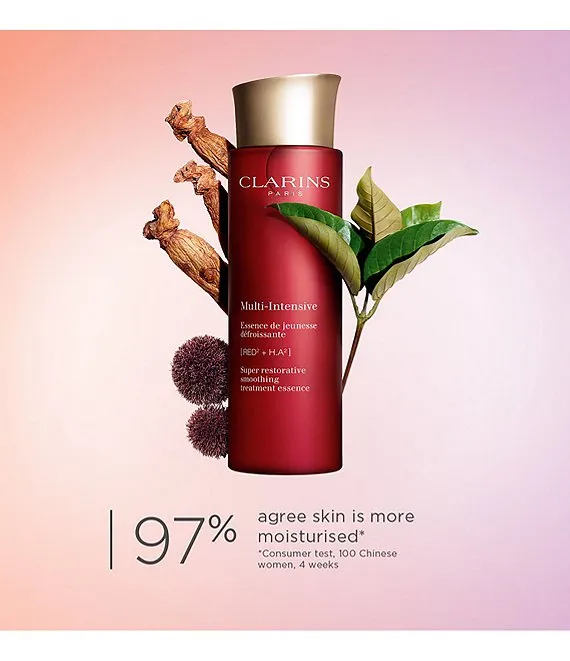 Super Restorative Treatment Essence contains Clarins' proprietary, plant-based [Red² + H.A²] Complex, a potent blend of exfoliating Red Jania extract, energizing Organic Red Ginseng extract + a double dose of hyaluronic acid that delivers 8 hours* of continuous hydration to visibly smooth, plump and re-energize, leaving skin looking radiant and renewed day after day.