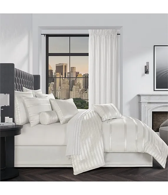 - Modern lustrous look with its geometric polished platinum stripes on a plush white satin fabric