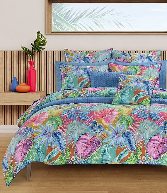 - Featuring a variety of tropical foliage in shades of aqua, orange, pink, and blue
