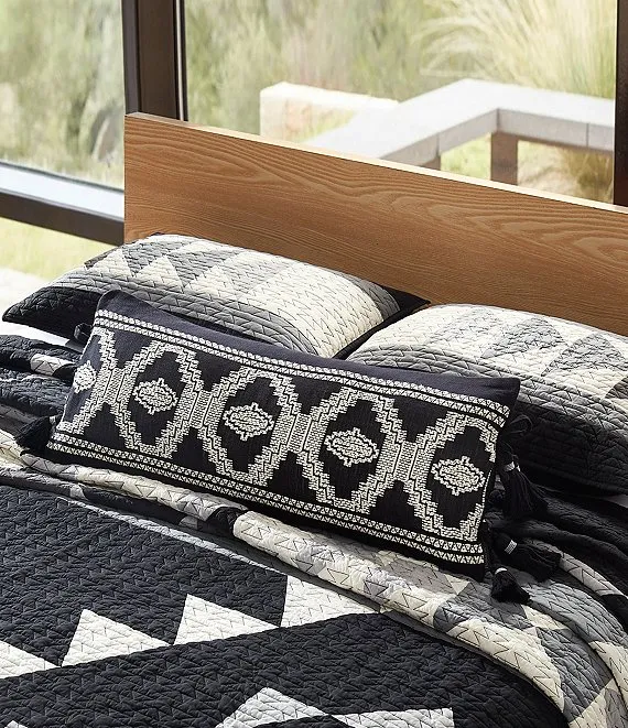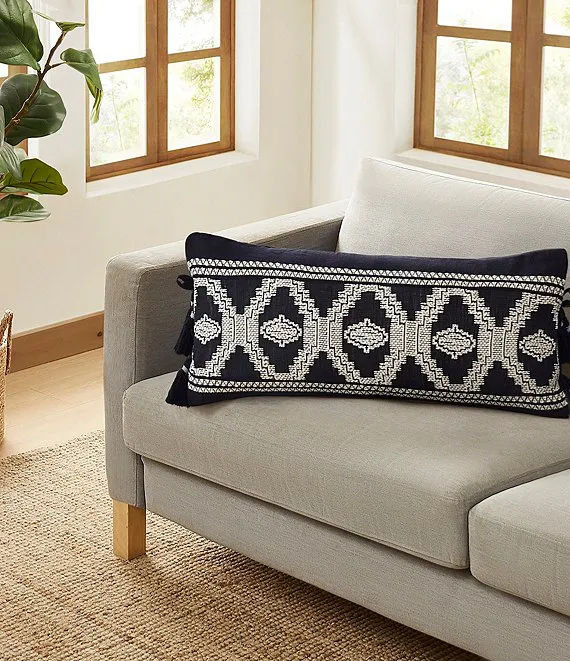 • A striking geometric design in black and white will enliven your space on this rectangular pillow edged by tassels and ties.