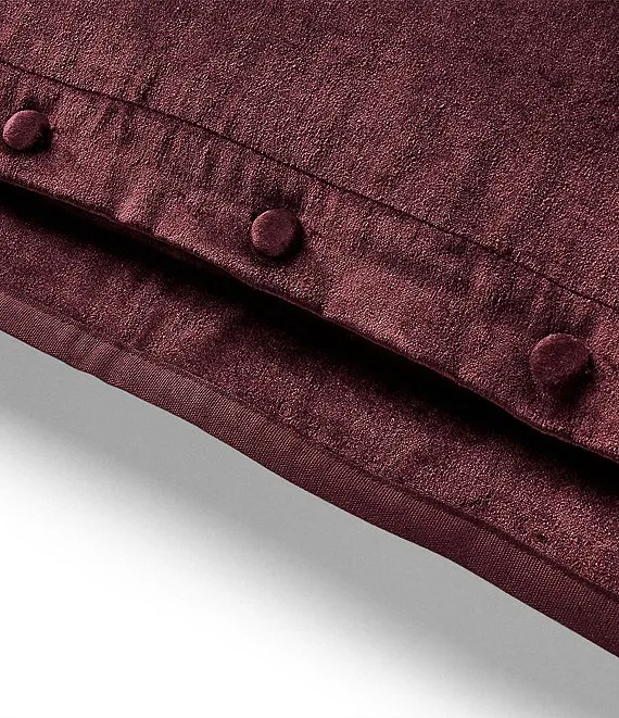 - This soft velvet sham is presented in a rich burgundy hue with tonal piped trim at the edges. A classic placket with elegant fabric-covered buttons details the back.