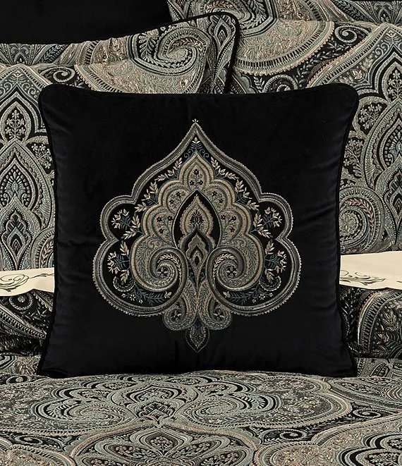 - Embroidered damask design in teal, pewter, taupe and gold hues