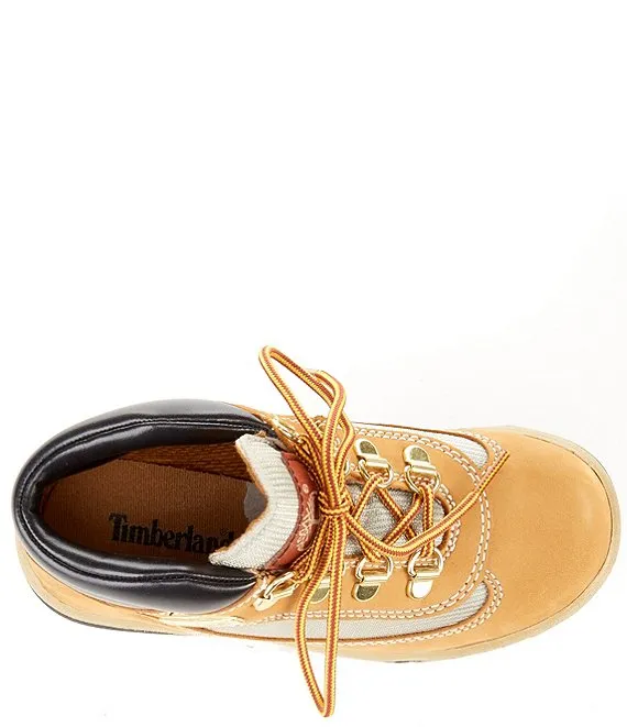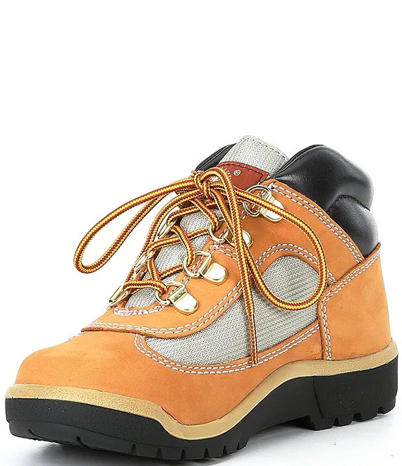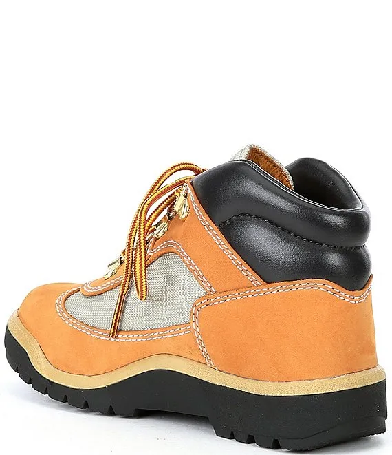 From Timberland, the Boys' Field Nubuck Leather and Mesh Boots feature: