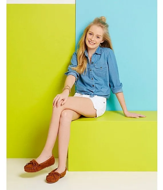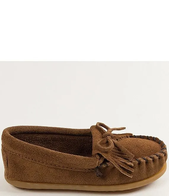 From Minnetonka, the Kids' Kilty Suede Whipstitch Moccasins feature: