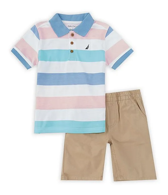 Little Boys 4-7 Short-Sleeve Wide-Striped Jersey Polo Shirt & Sold Twill Shorts Set