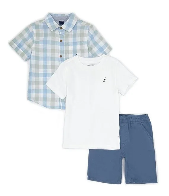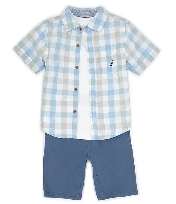 Little Boys 2T-7 Short Sleeve Plaid Woven Shirt, Solid Short Sleeve Jersey T-Shirt & Solid Woven Shorts Set