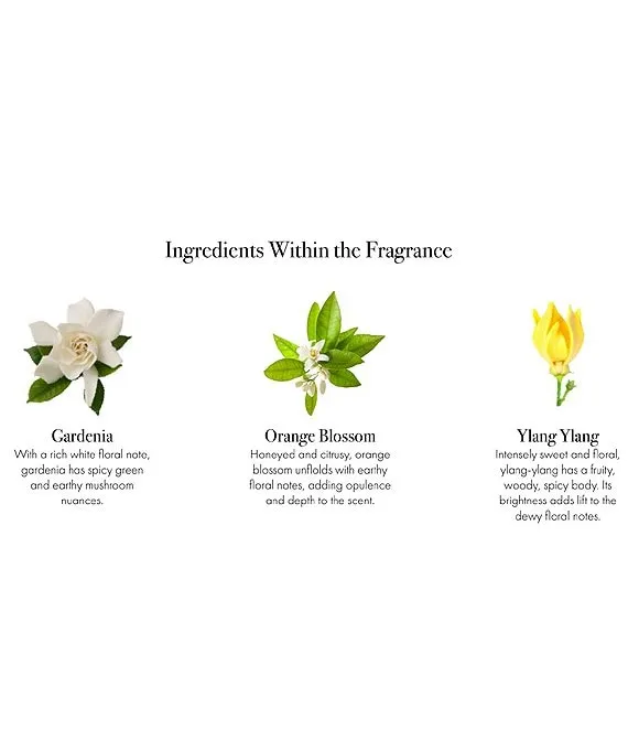 Fragrance Notes: Top notes are the first impression of a fragrance.Lemon, Apple, Leafy GreensMiddle notes are the heart of the fragrance.Gardenia, Neroli, Orange FlowerBottom notes are the final and lasting impression.Cedar, Musk, Orange Blossom