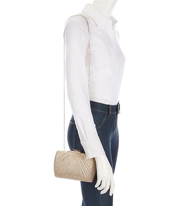 From Landry, the Pleated Lurex Tweed Minaudiere Clutch features: