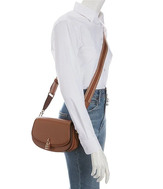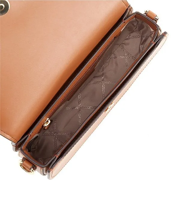 From Michael Kors, Mila Medium East West Gold Tone Sling Messenger Bag features: