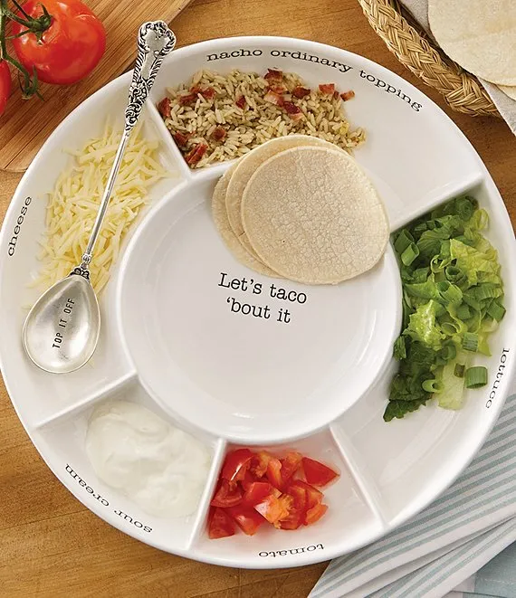 - sectioned ceramic server with taco topping labels and "nacho ordinary topping" and "let's taco 'bout it" messages