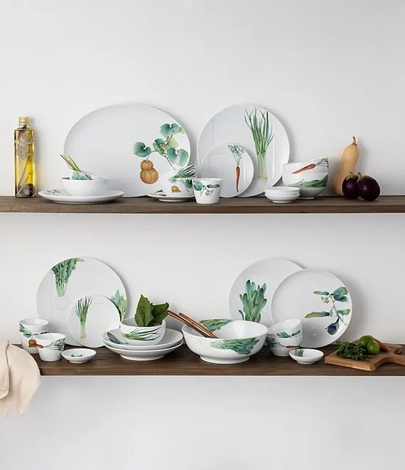 The Kyoka Shunsai Collection celebrates Kyoka's local and traditional vegetable motifs, depicted on stylish white porcelain. The collection, inspired by Japanese watercolors, brings to mind the nurturing delights of a home-cooked meal that helps one to unwind from a busy day. The Kyoka Shunsai collection offers place setting components and a variety of serving pieces. Kyoka Shunsai is designed for daily use and is dishwasher and microwave safe.