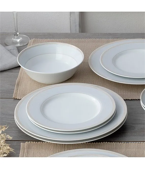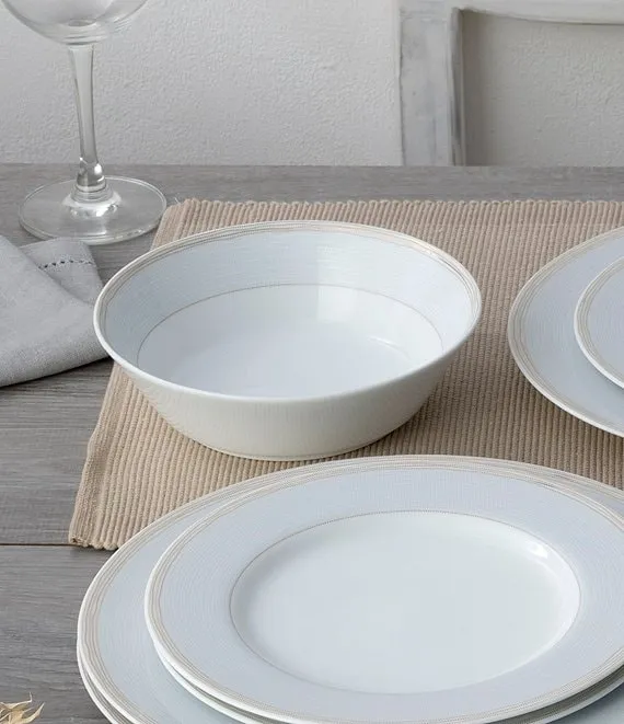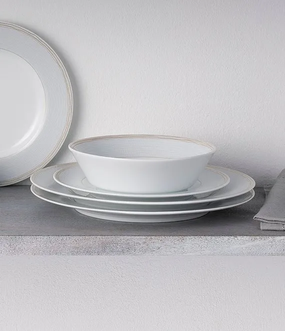 Linen Road was inspired by the texture of linen fabric. The soft feeling of the fabric texture is enhanced with bands of implied golden embroidery on white porcelain. Linen Road offers place setting components as well as an array of serving pieces and accessories. Linen Road is suitable for everyday use and is dishwasher safe!