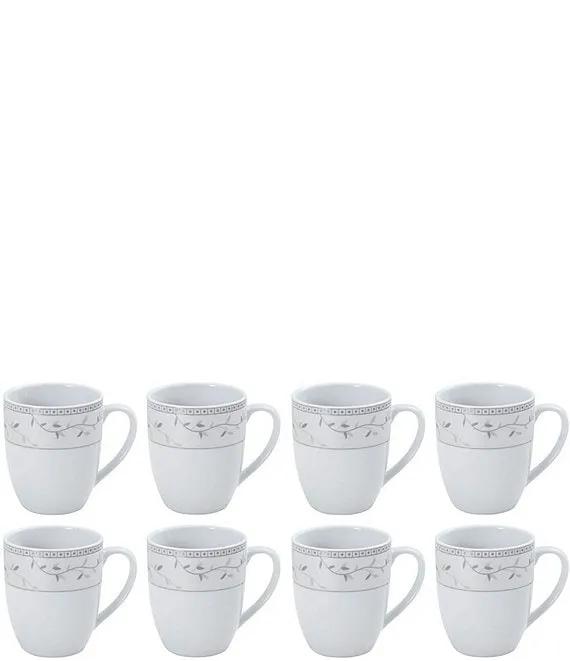 - 32-piece dinnerware set, service for eight, includes dinner plates, salad plates, soup/cereal bowls, and mugs