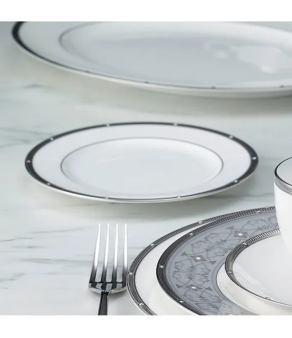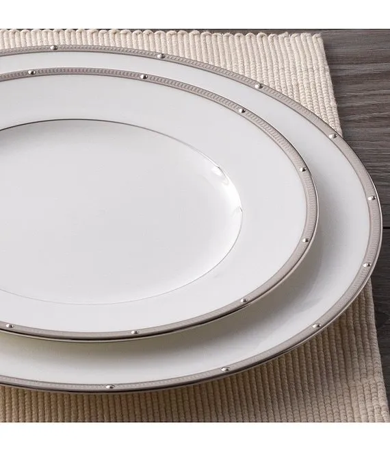 Crafted on classic bone china, Rochelle Platinum is a fine dinnerware pattern with a band of etched Platinum with raised, Platinum dots for a classic look. Rochelle Platinum offers traditional place setting components, additional items for individual service, and serving pieces. Rochelle Platinum is suitable for daily use and is dishwasher safe.