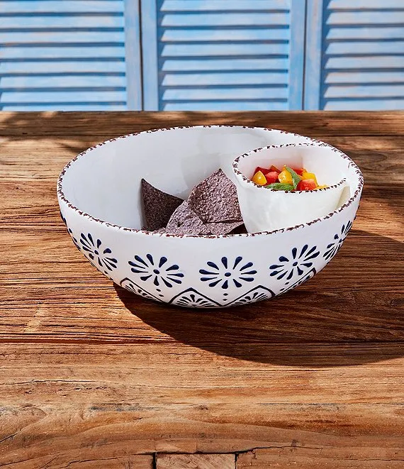 From Mud Pie, this chip server with integral dip bowl and hand-painted rim features: