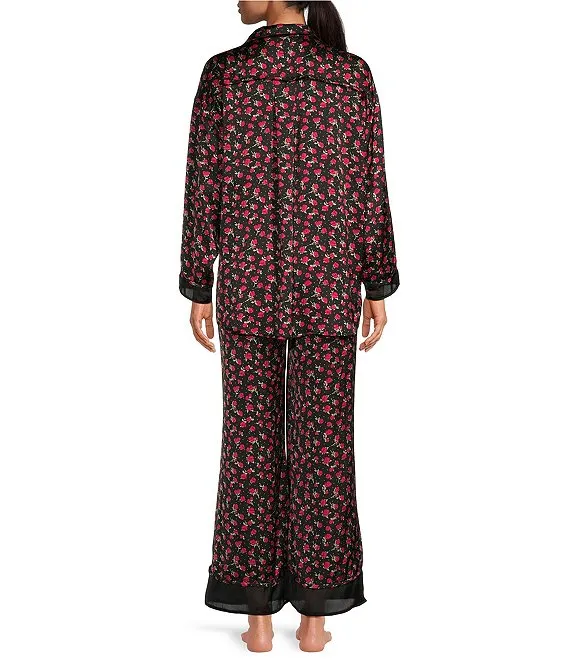 Satin Floral Print Sleeveless Square Neck Cami & Split Wide Leg Pant Pajama Set