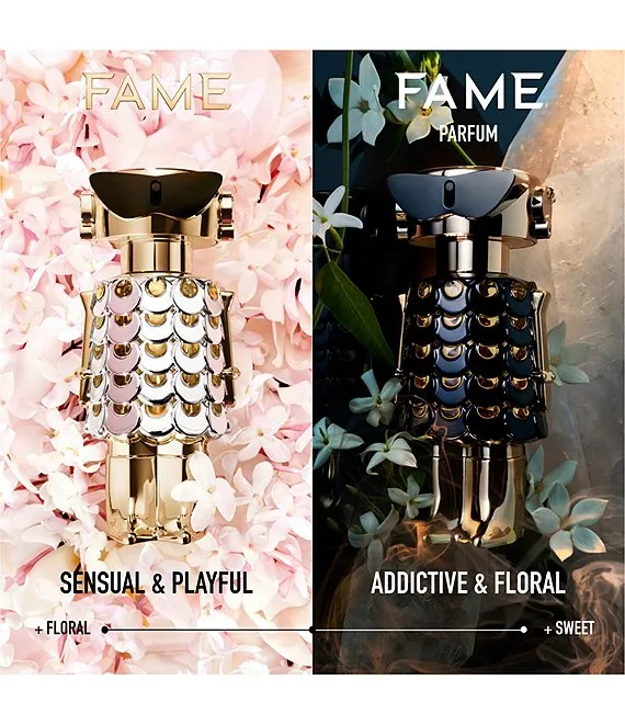 Powered by multifaceted femininity, new FAME Parfum by Rabanne reveals her most enticing facet. Sensual jasmine meets hypnotic incense and irresistible musk in an intense fragrance blend that’s just as famous as her. Feel magnetic. Be the star. Be FAME PARFUM.
