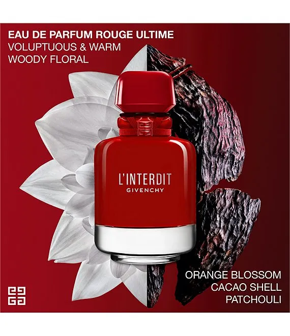 A white flower bouquet laced with warm Cacao Shell fuse together in this warm floral fragrance. Usually discarded, cacao shells are upcycled and transformed to reveal all the power of the perfume, magnified by patchouli and vetiver wood accord. Givenchy opens a new Rouge chapter with L'Interdit Eau de Parfum Rouge Ultime, the fragrance for women who dare to be bolder than ever.