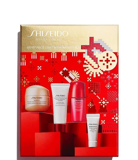 Opt for smoother skin with this wrinkle correcting regimen set that includes convenient travel sizes. Clarifying Cleansing Foam gently whisks away impurities, Ultimune Power Infusing Concentrate strengthens skin and boosts radiance, Benefiance Wrinkle Smoothing Cream Enriched visibly corrects lines and wrinkles, and NEW Benefiance Wrinkle Smoothing Eye Cream targets six types of eye wrinkles for a smoother complexion all over.
