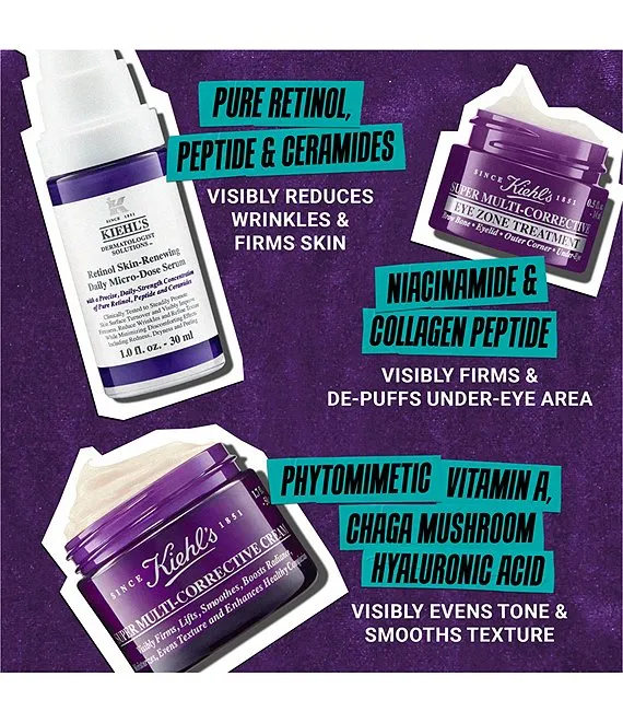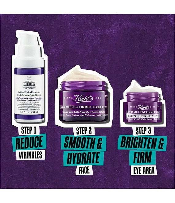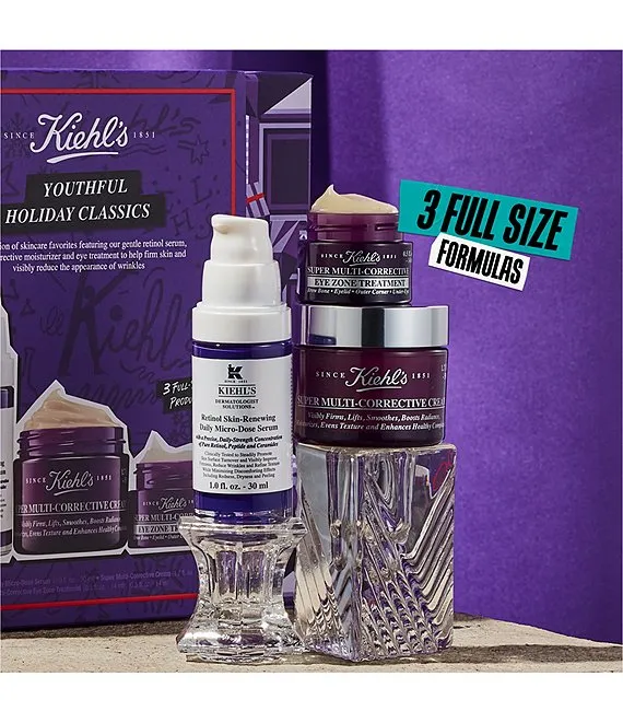 This set of 3 full-size anti-aging skincare essentials features Kiehl's gentle Retinol, youth-boosting eye cream and multi-benefit moisturizer to help visibly reduce wrinkles and smooth fine lines to reveal younger-looking skin. $201 Value!