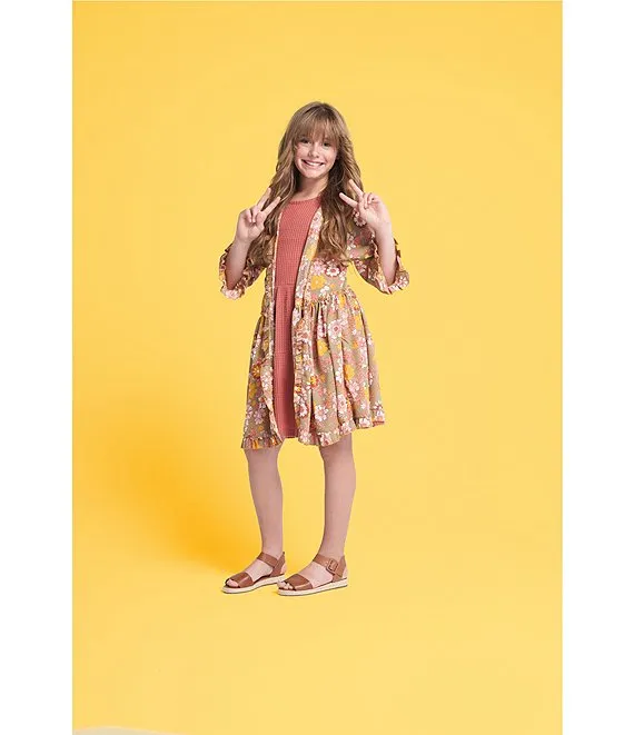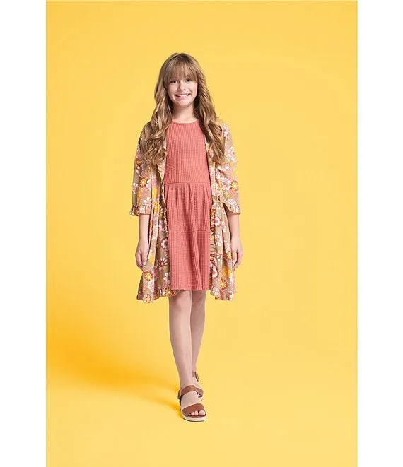 • Big Girls 7-16 Long-Sleeve Floral-Printed Dobby Kimono, Waffle Knit Fit-And-Flare Dress & Necklace Set