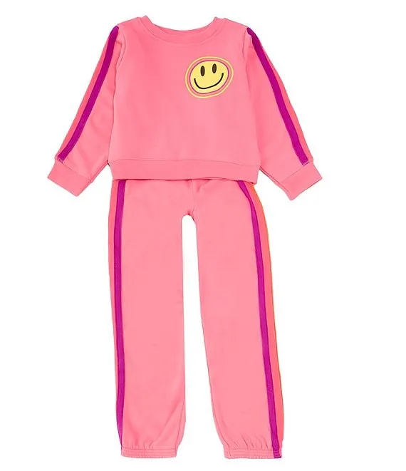 - Matching jogger pants with pull-on styling and an elastic waist plus striped taping down both sides and elasticized leg hems
