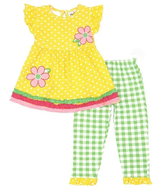 • Little Girls 2T-6X Flutter Sleeve Dotted Knit Flower-Appliqued Dress & Checked Leggings Set