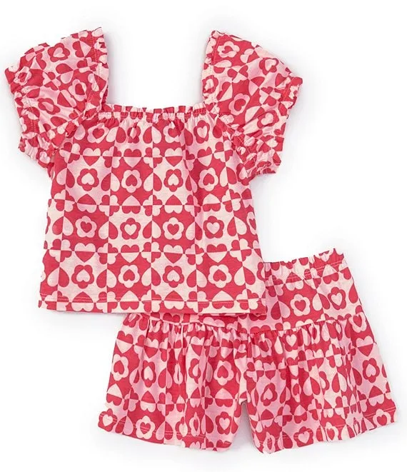 • Little Girls 2T-6X Heart Print French Terry Ruffled Short Set