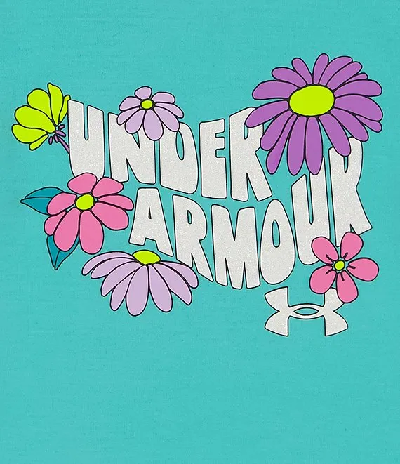 - "Under Armour" block lettering, flower graphics, and icon logo detail on the chest