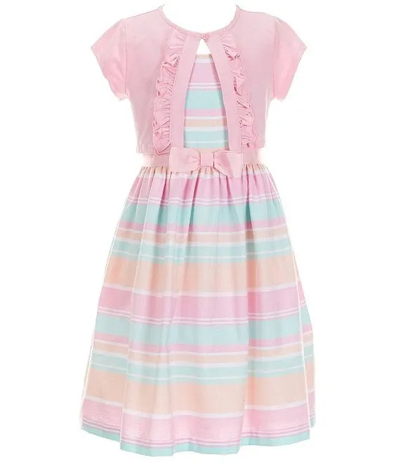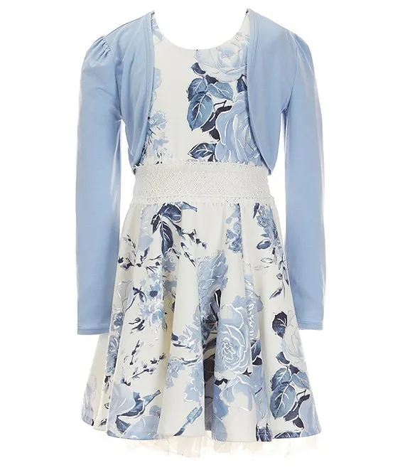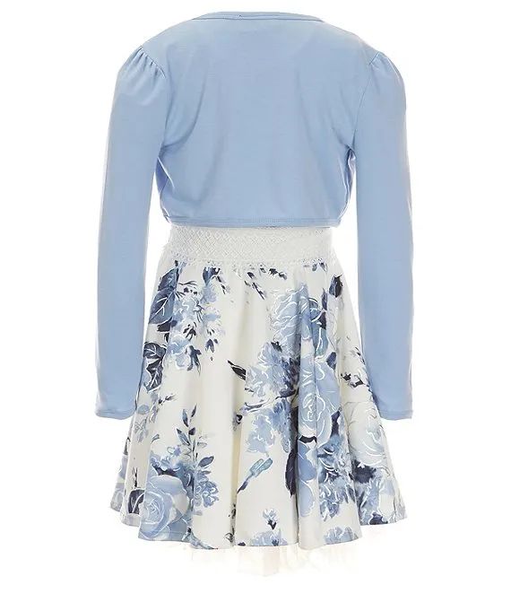 Big Girls 7-16 Long Sleeve Solid Cardigan with Sleeveless Print Exposed Ruffle Shug Dress 2-Piece Set